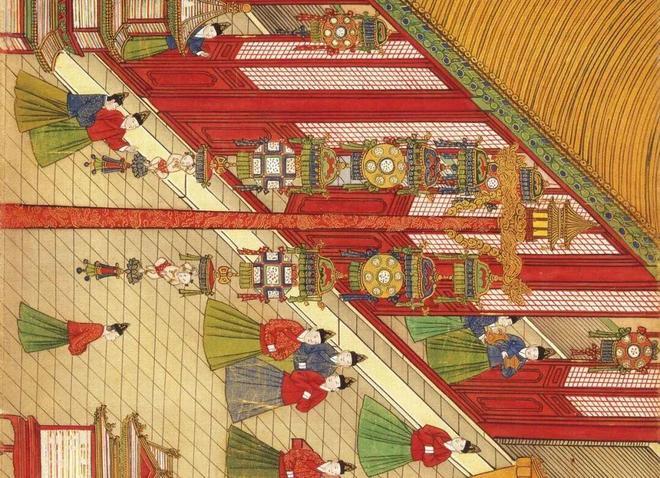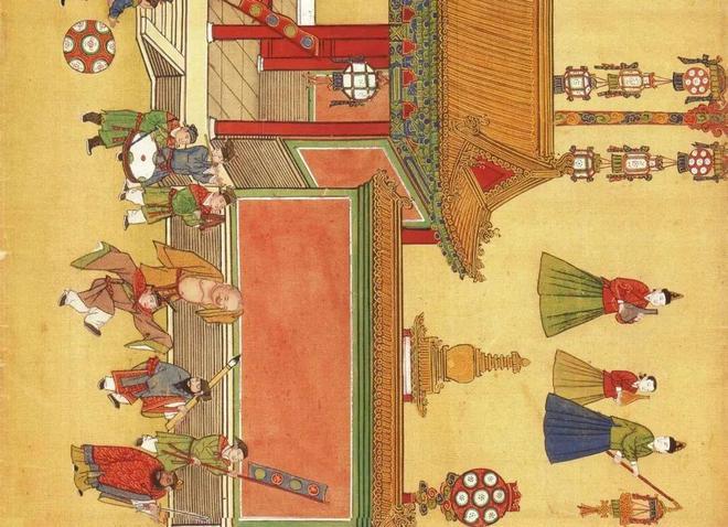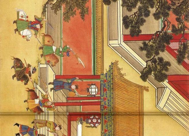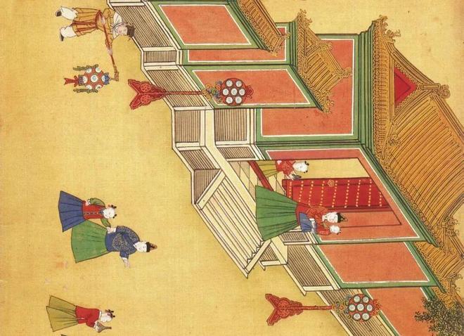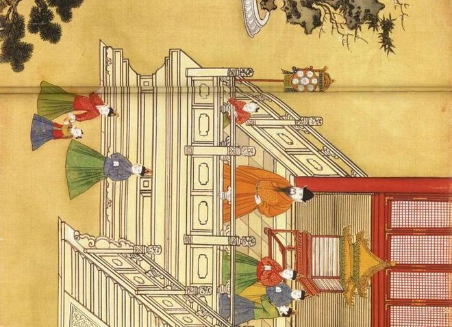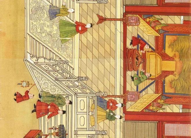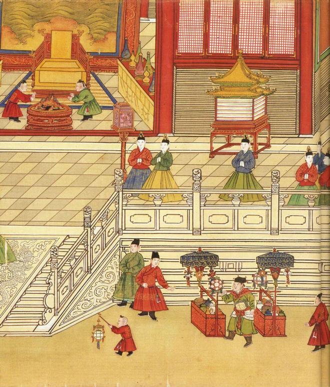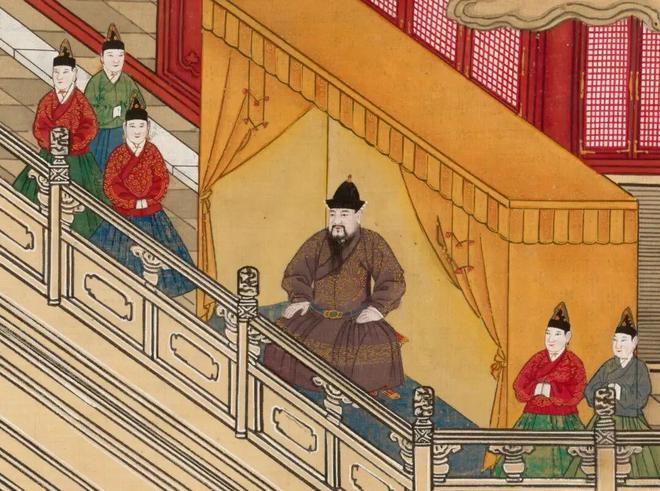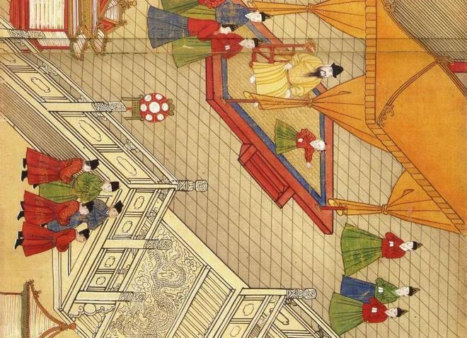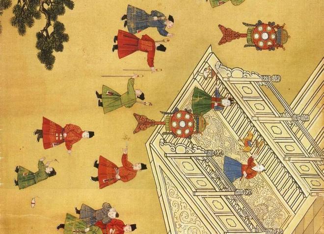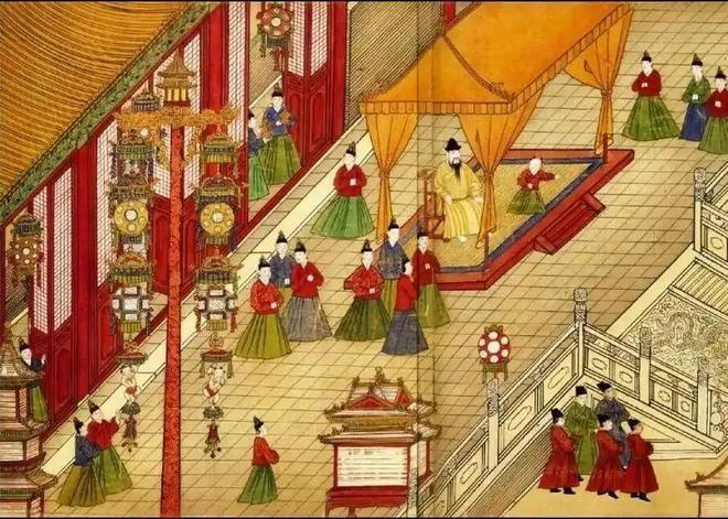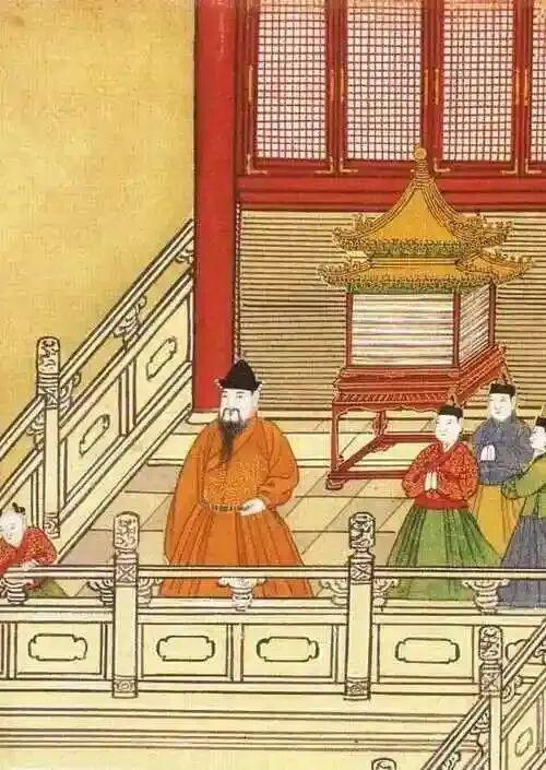 此时的宪宗,则头戴黑色檐帽,学名“青花纻丝窄檐大帽”,身着浅青色绣金龙袍,安坐于殿外左侧黄帐之下。