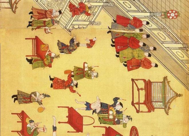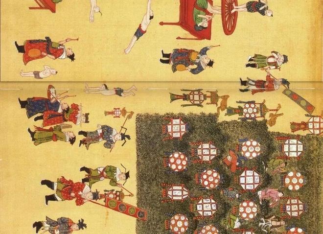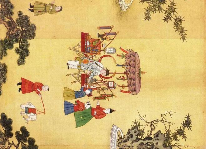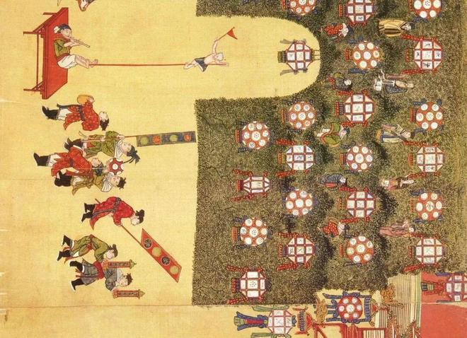 03此画第三段中的宪宗没有位于画面的中心,而是位于整个画幅的最左边。在左边高台大殿,殿前黄帐篷下宪宗端坐观赏台下的各种演出,目不转珠,凝神注视各场精彩表现,显得神旷怡人,悠闲自得,别有趣味。
