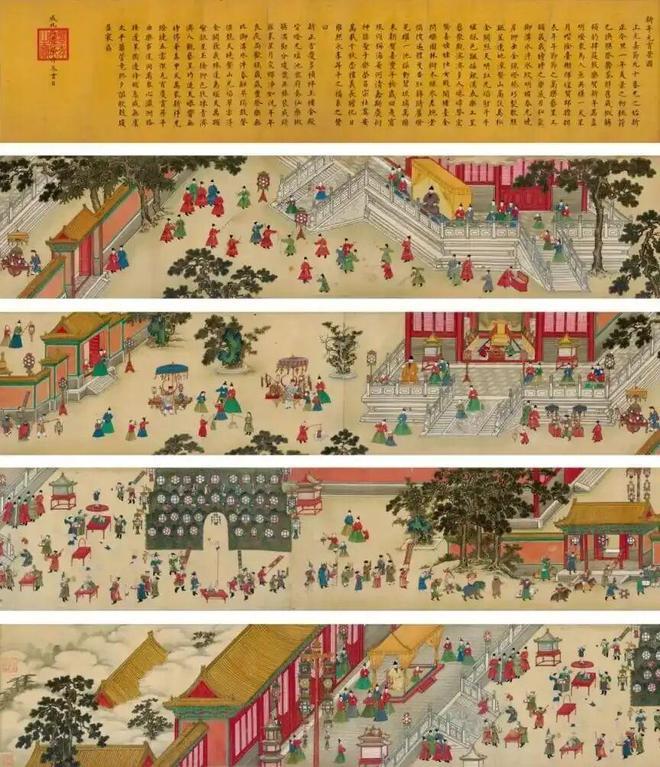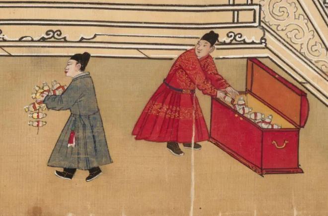 01此画第一段是开场,画面中有太监从大木箱中往外取爆竹,然后分发给众人。元宵节放鞭炮,实际上也算是一种祈福活动,象征着欢乐喜庆和祝福。