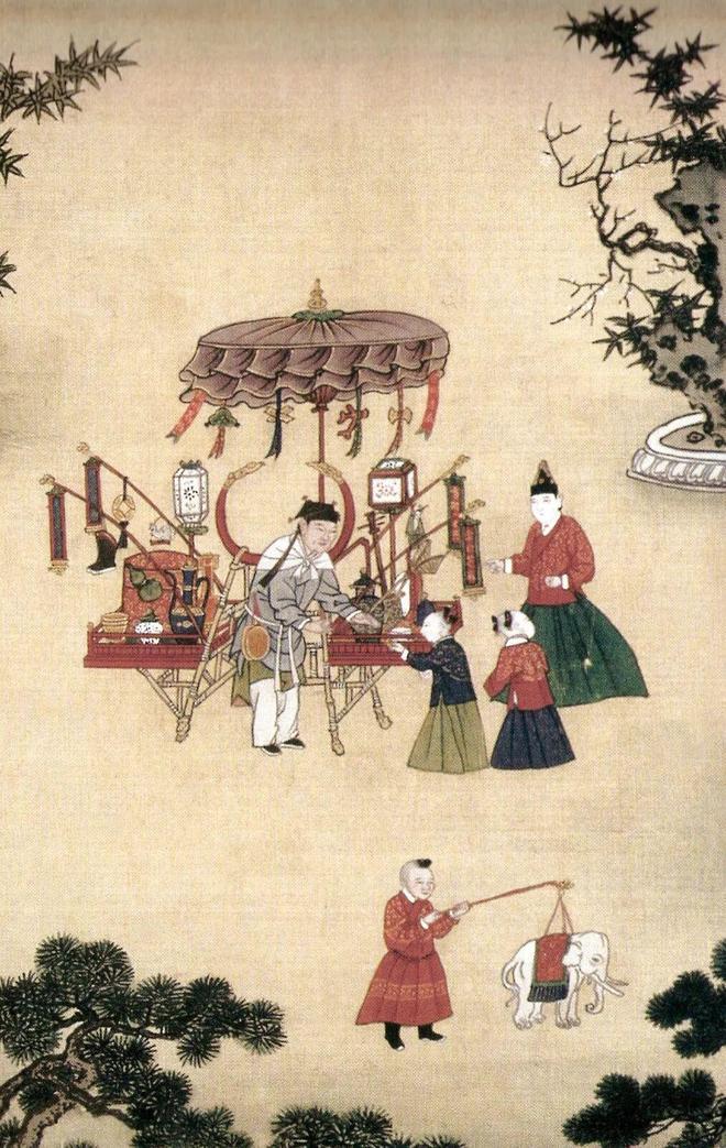 宪宗别出心裁,将走街串巷的“货郎”引入大内,使长于深宫的皇子、公主也能体验到民间过节的喜庆氛围。货郎车上琳琅满目,顶盖上挂着各色彩灯。