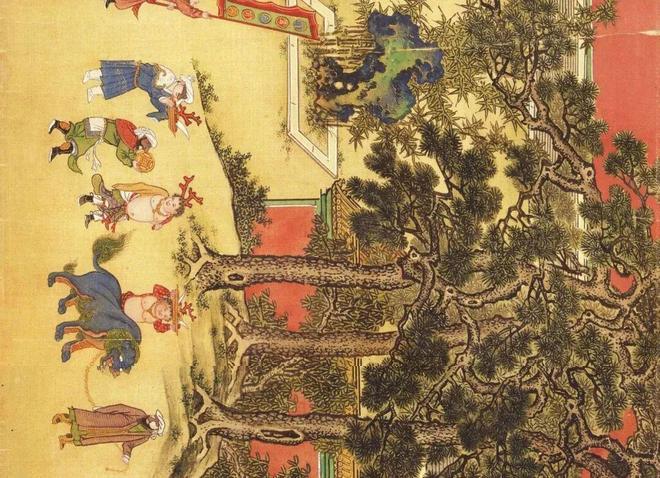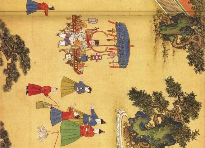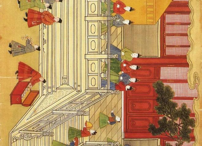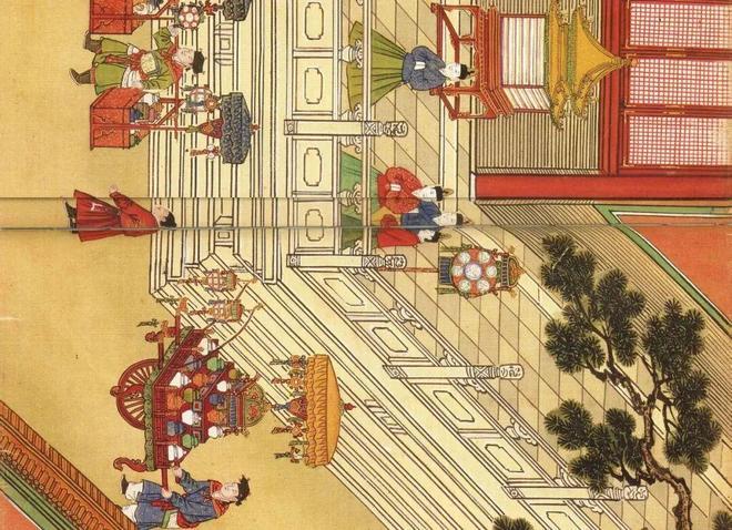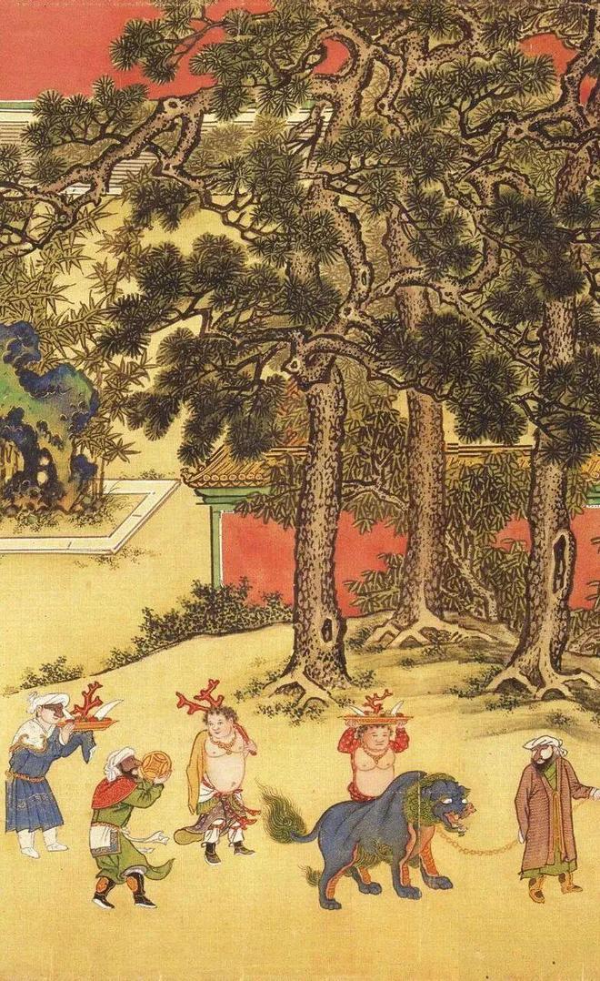 还有伴随着奏乐向右行进的外国使节模样的献宝队伍中,领头的人手牵瑞兽,其余的则多肩扛珊瑚,显示出帝国的强盛,在节庆欢愉之外,增添了强烈的政治寓意。