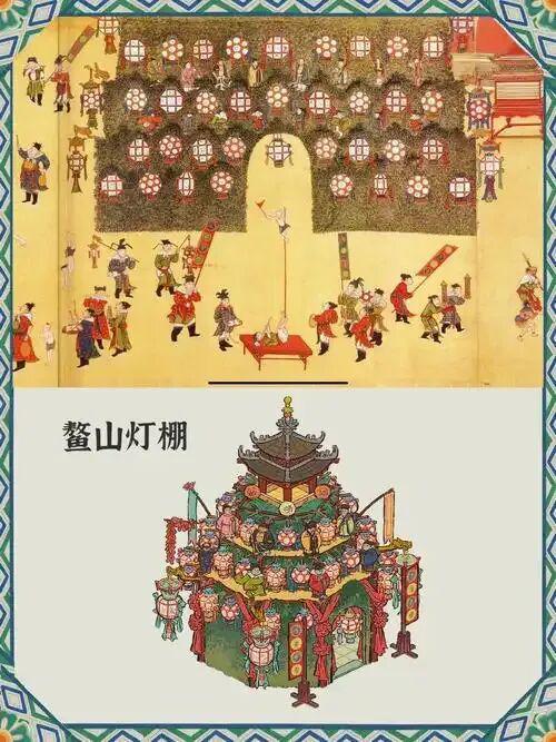 所谓的鳌山,就是堆成巨鳌形状的灯山。传说这是仿照玉皇大帝巨鳌的形状而建造,因此称“鳌山灯棚”。