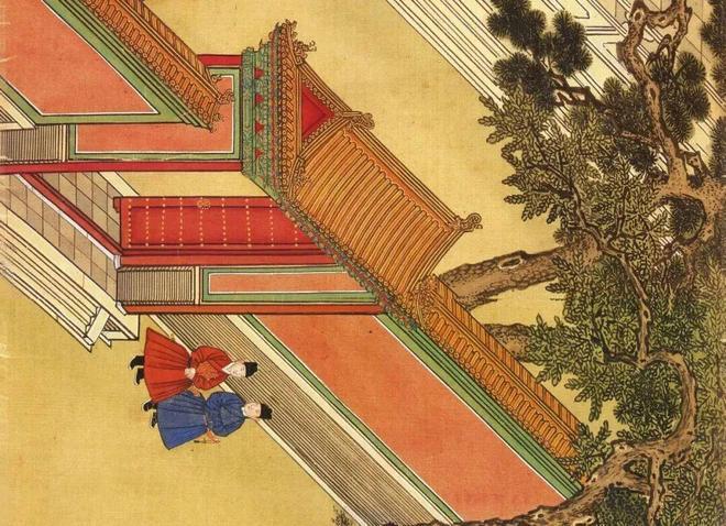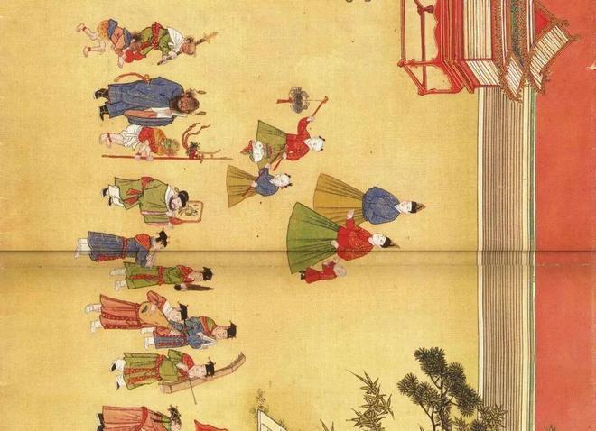 有一个捂着耳朵,躲在太监背后观看的儿童,据考证便是宪宗第五子,日后的岐惠王朱祐棆,时年八岁。