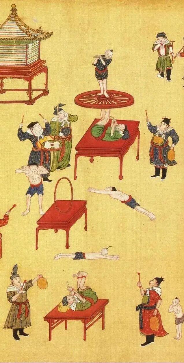 在一片锣鼓声及伴奏着诸多的乐器声中,艺人或倒立、或腾跃、或钻圈、或变化魔术、或表演气功,各种绝技、精彩多姿。