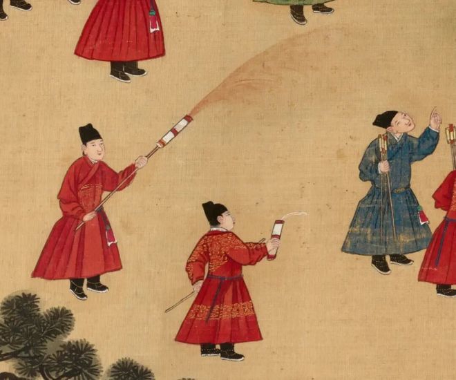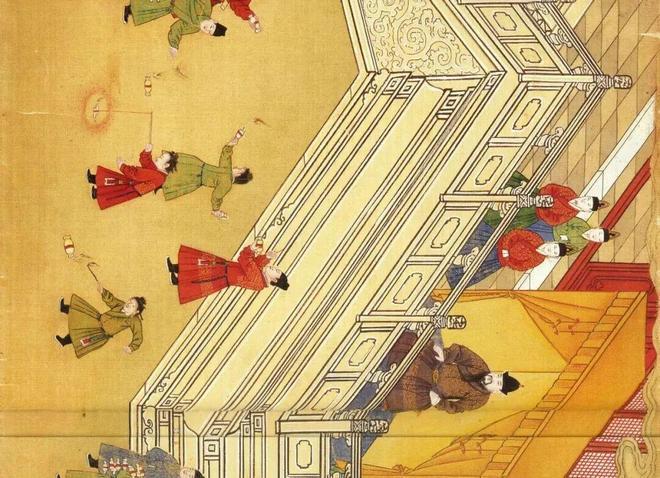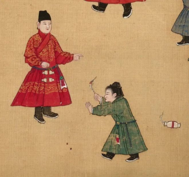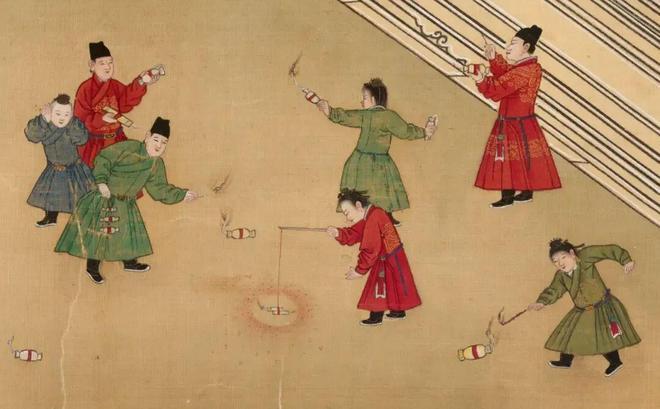 画面中,宦官们开始放爆竹之时,胆大的拿在手里放,胆小的在地上放。